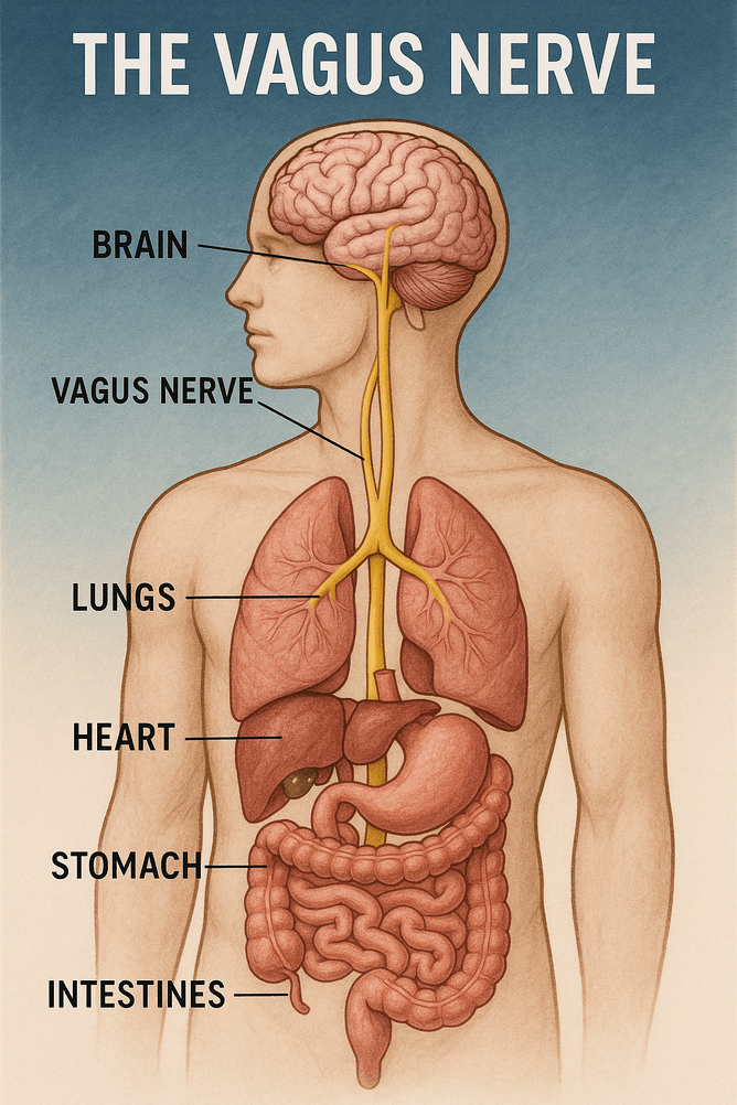 The Vagus Nerve (pronounced vay-gus) is the longest cranial nerve in the body. It starts in the brainstem and travels down through the face, heart, lungs, and digestive tract. It plays a central role in the parasympathetic nervous system—your body's rest, digest, and repair mode.